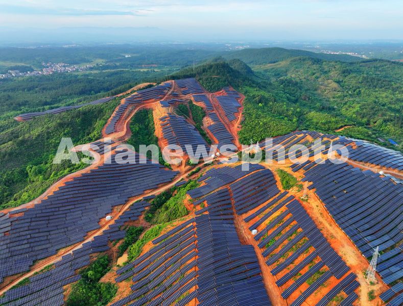 2024年4月23日,江西吉安永新县莲洲乡的一座石漠化荒山建起一排排光伏发电板,源源不断地输出绿色能源。