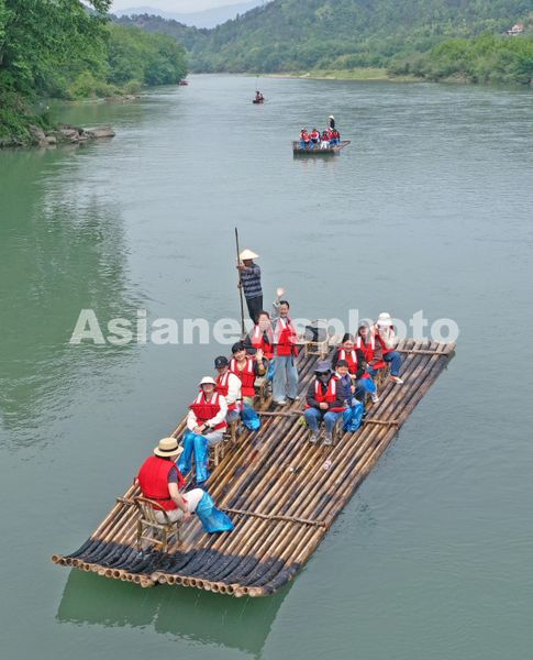 图片说明:2024年4月26日,游人在浙江省台州市仙居县永安溪乘坐生态竹筏漂流,乐享大自然美景。