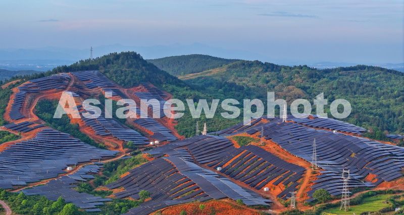 2024年4月23日,江西吉安永新县莲洲乡的一座石漠化荒山建起一排排光伏发电板,源源不断地输出绿色能源。