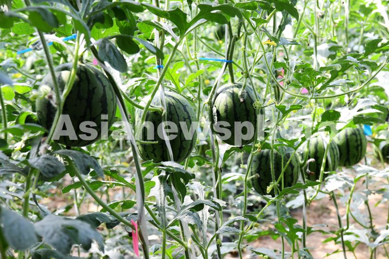 2024年4月25日,在河北省邯郸市广平县西瓜种植基地,吊蔓西瓜长势喜人。