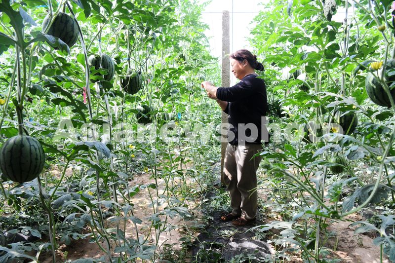 2024年4月25日,在河北省邯郸市广平县西瓜种植基地,瓜农在管理吊蔓西瓜。