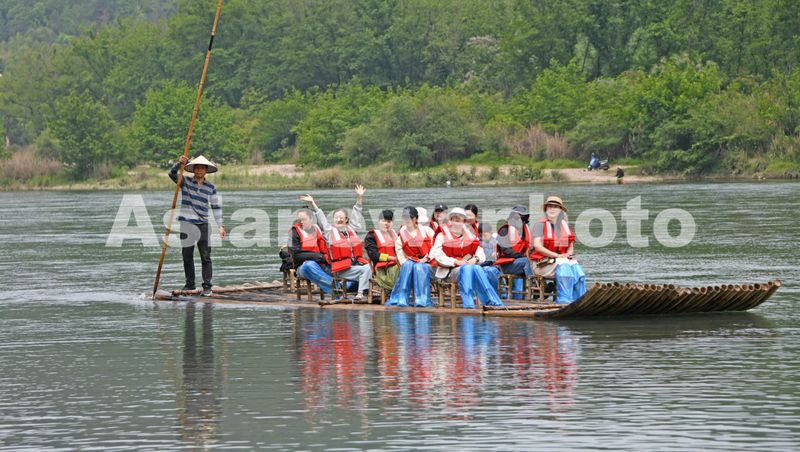 图片说明:2024年4月26日,游人在浙江省台州市仙居县永安溪乘坐生态竹筏漂流,乐享大自然美景。