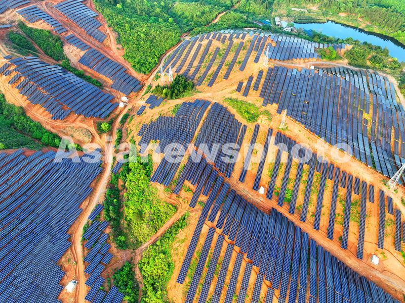 2024年4月23日,江西吉安永新县莲洲乡的一座石漠化荒山建起一排排光伏发电板,源源不断地输出绿色能源。