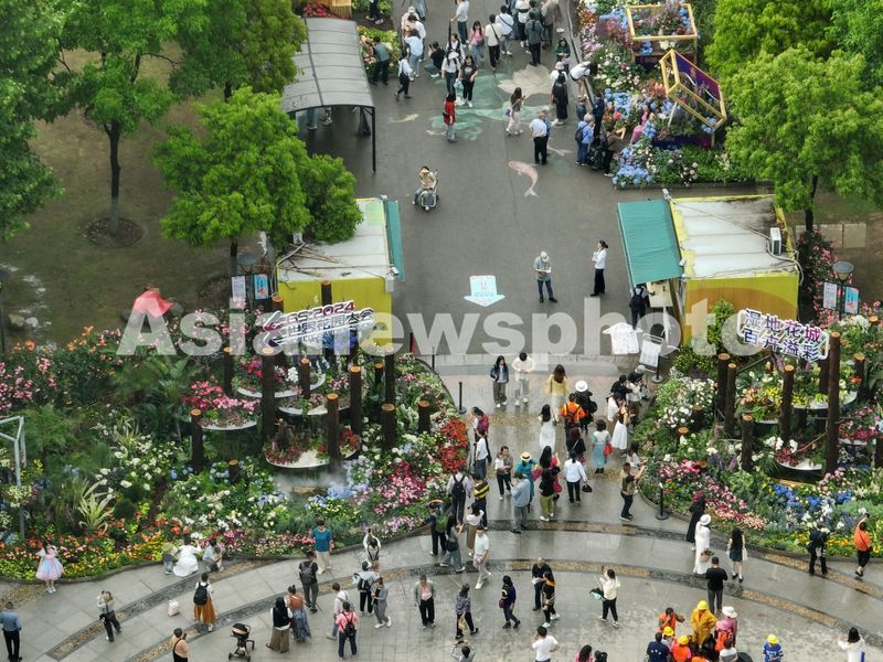 2024年4月28日,世界花园大会武汉会场开幕在武汉园博园、沙湖公园开展,各色鲜花竞相绽放,市民游客穿梭于各展区之间,拍照打卡。