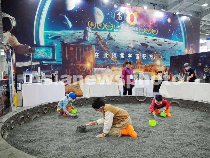 2024年4月28日,北京首钢国际会展中心,小朋友在2024中国科幻大会“潮幻奇遇季”上体验“模拟月壤挖掘”。