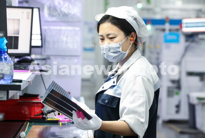 图片说明:2024年4月30日,江苏省淮安市工人在加工生产发电光伏板。