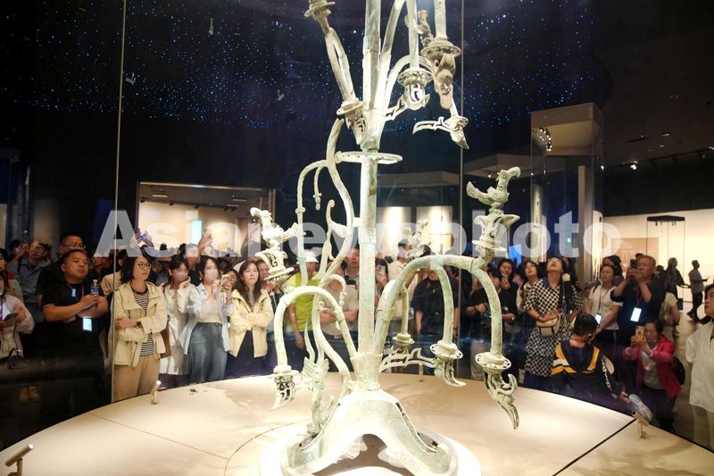 图片说明:2024年4月26日,参观者在四川省广汉市三星堆博物馆内欣赏展品。