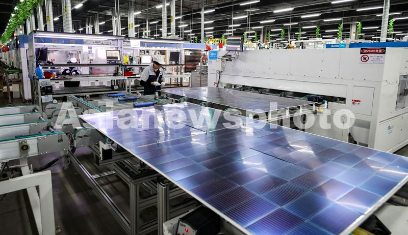 图片说明:2024年4月30日,江苏省淮安市工人在加工生产发电光伏板。