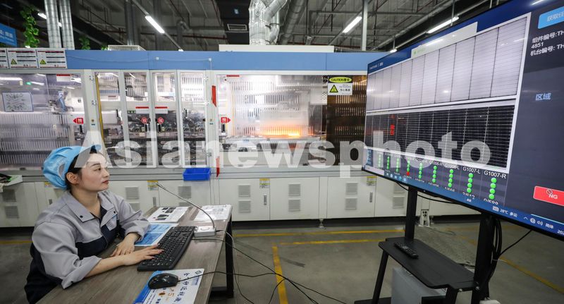 图片说明:2024年4月30日,江苏省淮安市工人在加工生产发电光伏板。