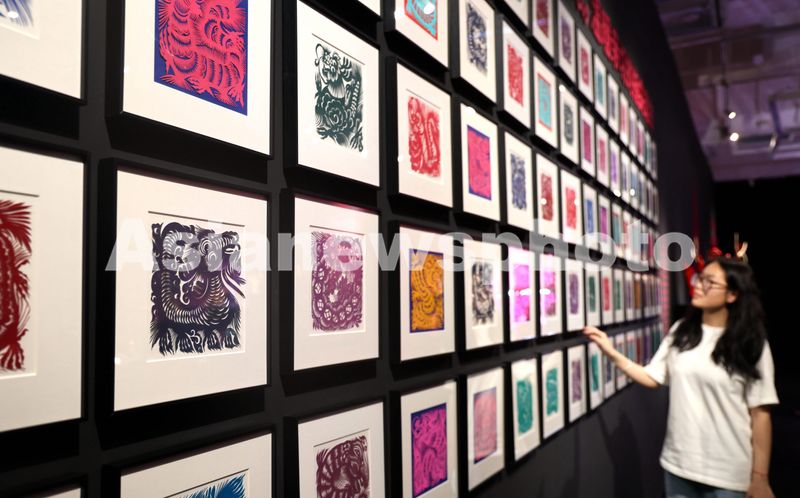 图片说明:4月29日,游客在西安美术馆参观“岁岁龙YUAN——龙主题艺术作品特展”。