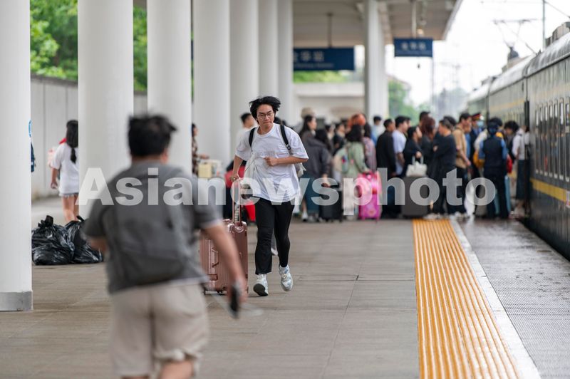 2024年4月30日,浙江省铁路金华站站台上,旅客小跑赶着乘车。