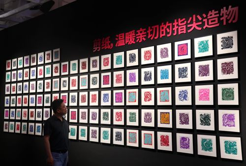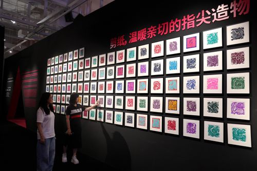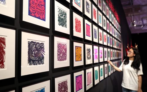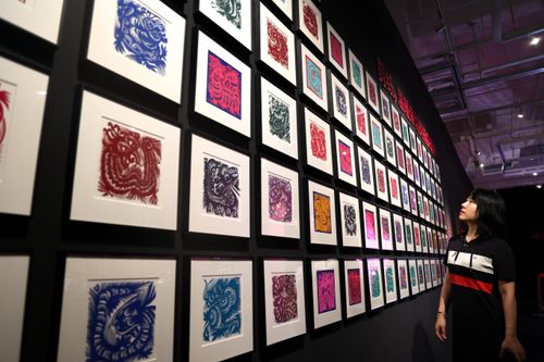 图片说明:4月29日,游客在西安美术馆参观“岁岁龙YUAN——龙主题艺术作品特展”。
