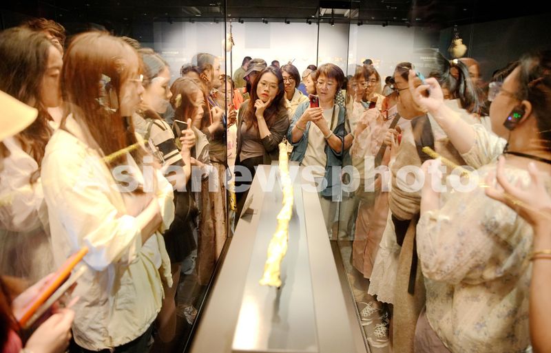 图片说明:2024年4月26日,参观者在四川省广汉市三星堆博物馆内欣赏展品。