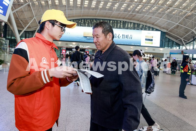 5月1日,志愿者在武汉站解答旅客问询。