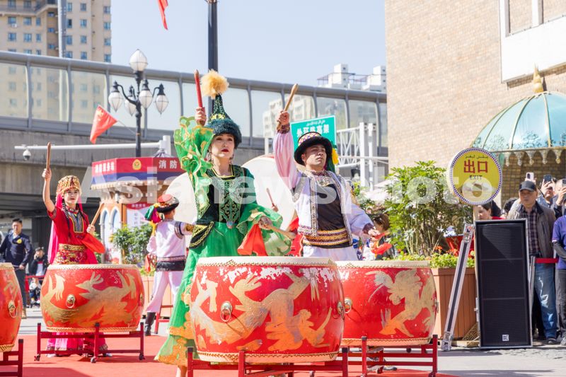 图片说明:2024年5月1日,在新疆国际大巴扎景区,演员为游客表演击鼓。