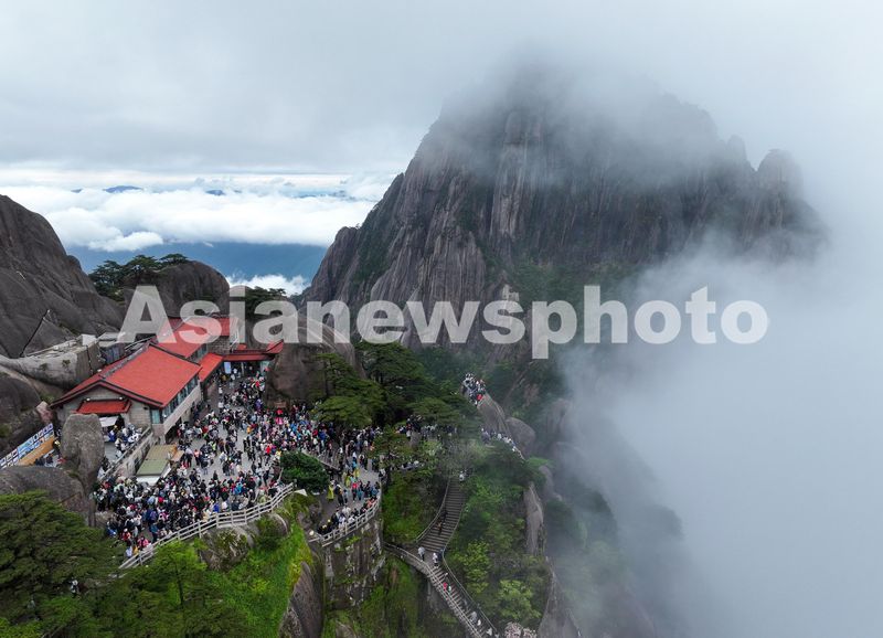 2024年5月1日,游客在安徽省黄山风景区欣赏云海美景。(无人机照片)