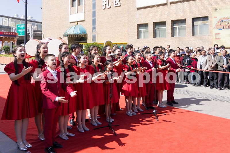 图片说明:2024年5月1日,在新疆国际大巴扎景区,学生为游客演唱歌曲。