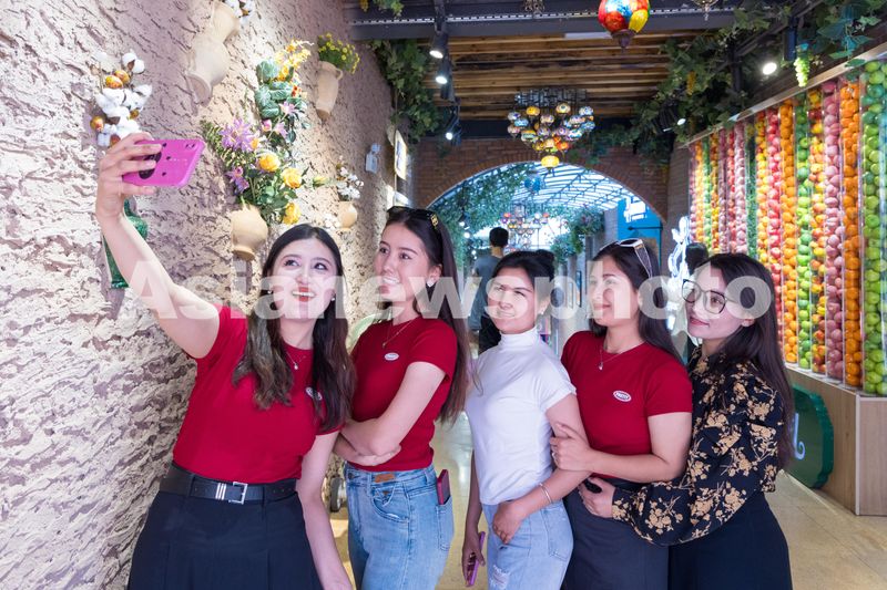 图片说明:2024年5月1日,在新疆国际大巴扎景区,游客正在自拍。