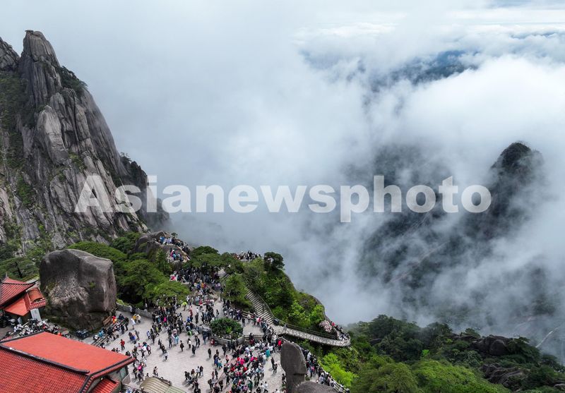 2024年5月1日,游客在安徽省黄山风景区欣赏云海美景。(无人机照片)
