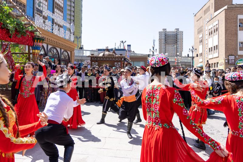 图片说明:2024年5月1日,在新疆国际大巴扎景区,演员为游客演绎维吾尔族婚礼现场跳起欢快地舞蹈。