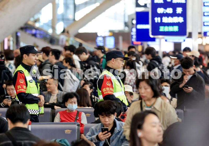 5月1日,武汉铁路公安处民警在武汉站候车大厅执勤。