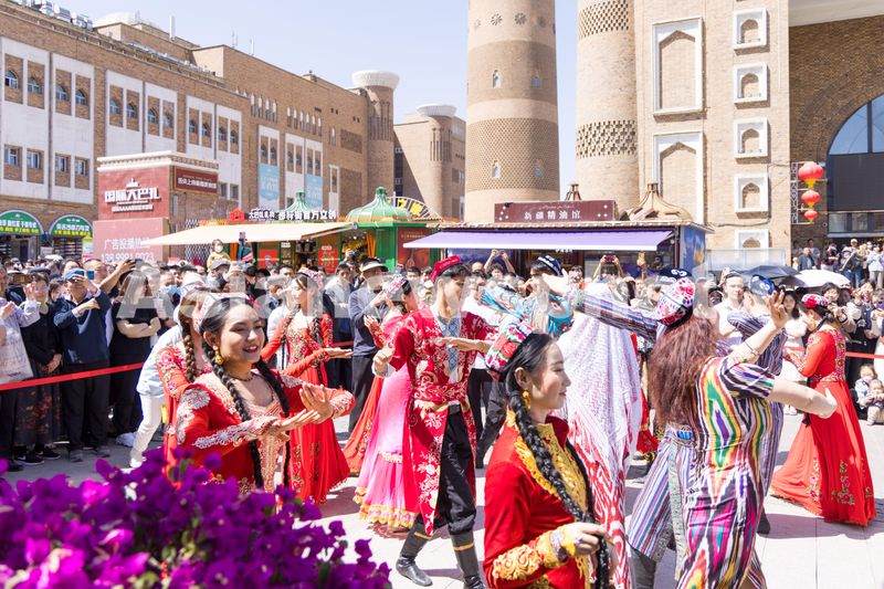 图片说明:2024年5月1日,在新疆国际大巴扎景区,演员为游客演绎维吾尔族婚礼现场跳起欢快地舞蹈。