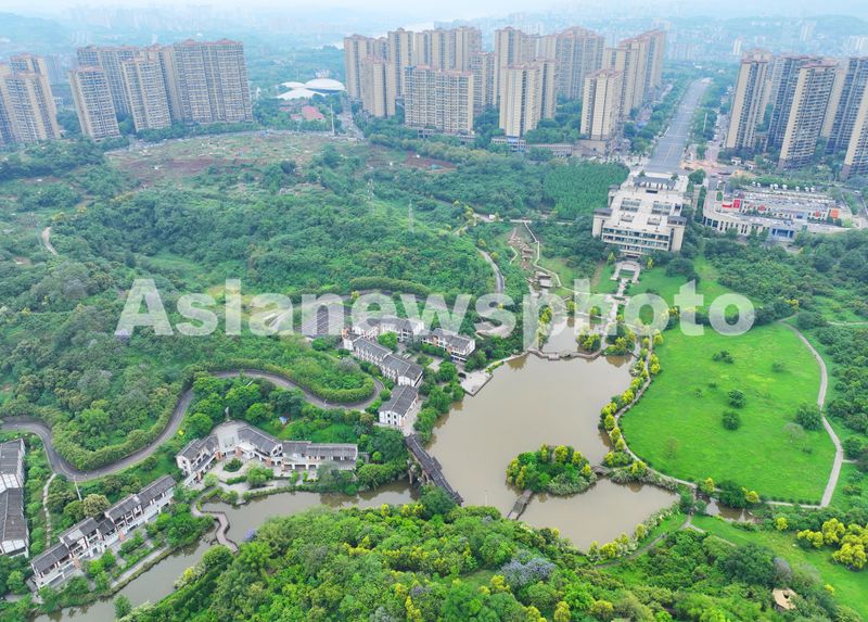 图片说明:5月1日,无人机镜头下,素有“十里绿色长廊”、“城市天然氧吧”等美誉的四川省泸州市张坝桂圆林公园,绿意盎然景色如画。