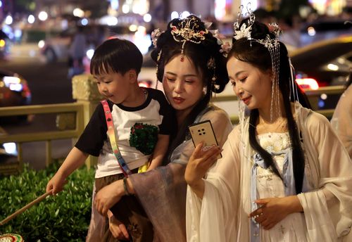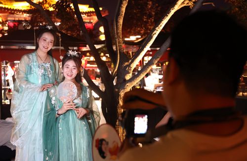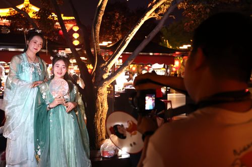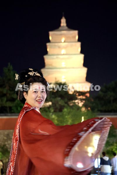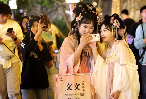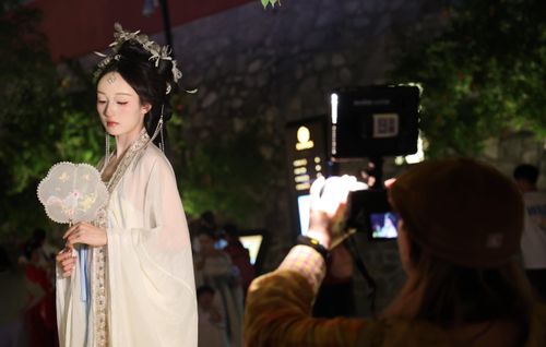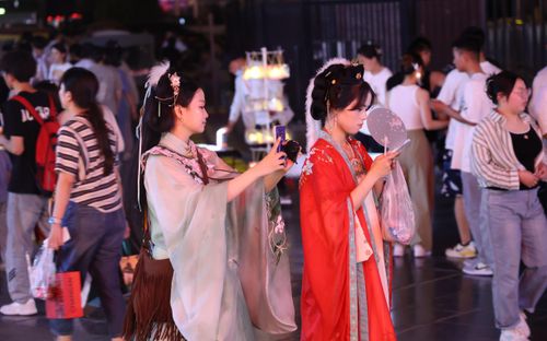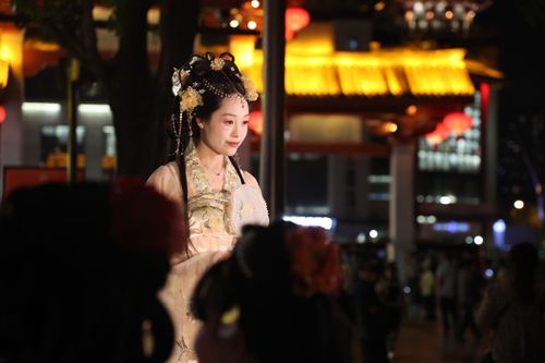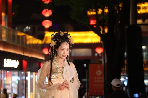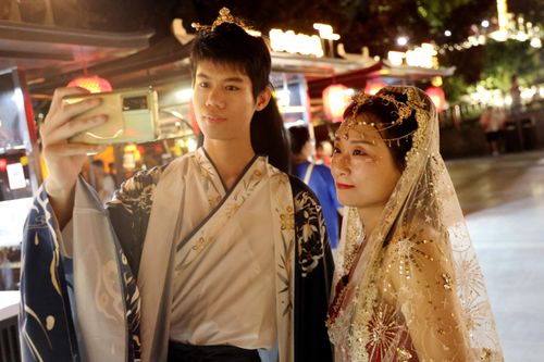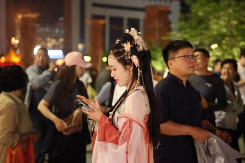 图片说明:5月2日,身着汉服的游客在陕西省西安市的大唐不夜城游玩。