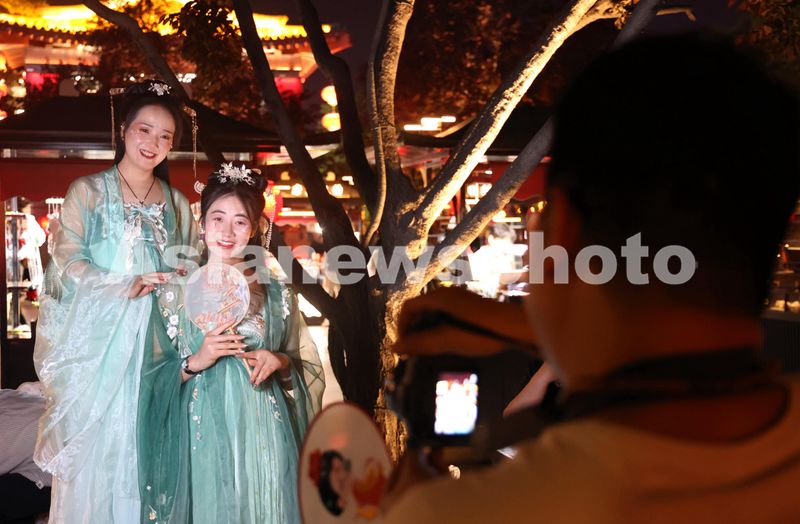 图片说明:5月2日,身着汉服的游客在陕西省西安市的大唐不夜城拍摄写真照片。