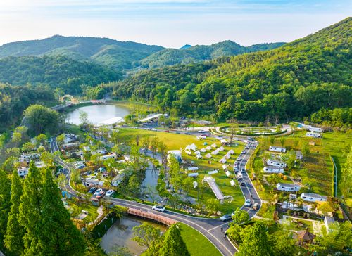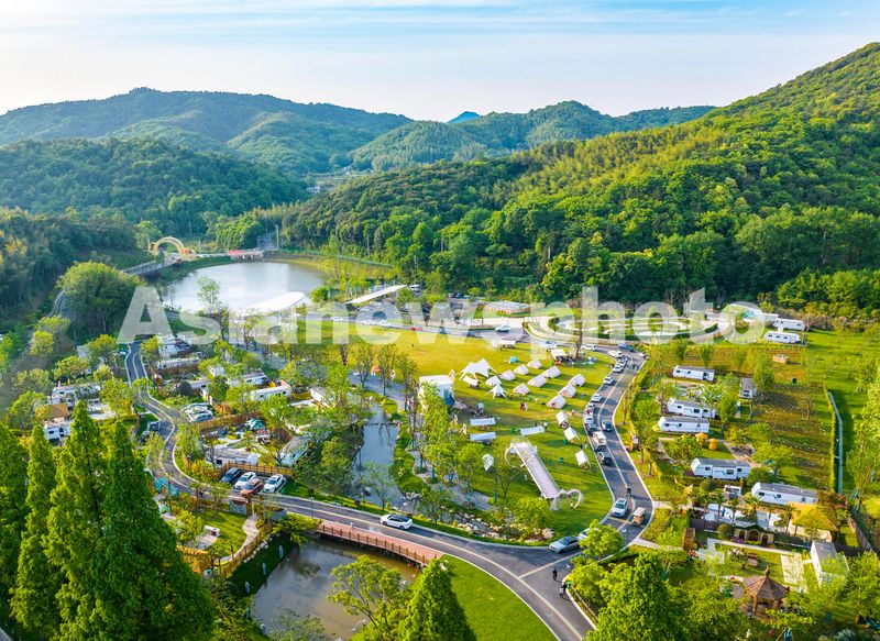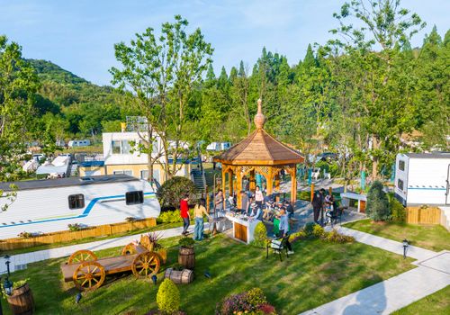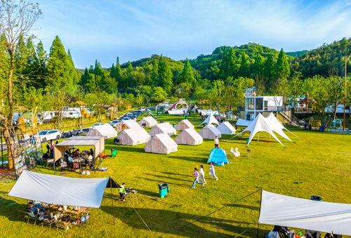 2024年5月1日,在安徽省芜湖市繁昌区孙村镇中分村途居马仁山房车露营地,数十辆房车和多顶露营帐篷错落有致分布在山林竹海间,优美的乡村生态环境,吸引了众多游客前来休闲游玩,欢度假日生活。