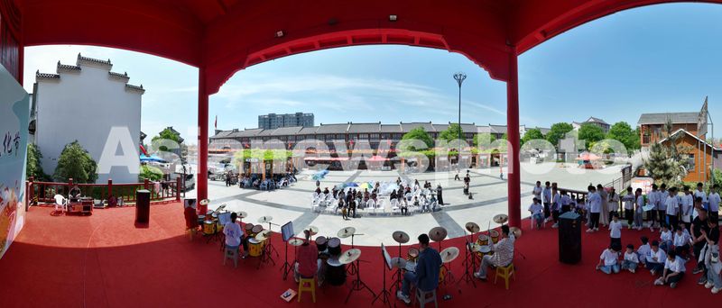 2024年5月2日,在山东省临沂市郯城县马头古镇风景区戏楼广场,演员为游客表演架子鼓(无人机全景照片)。