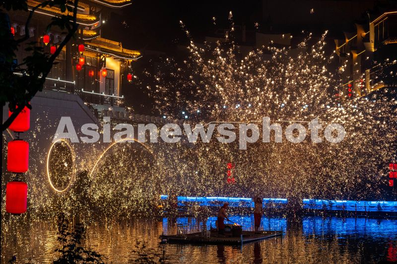 2024年5月2日,浙江省湖州市长兴县太湖龙之梦乐园,非遗“打铁花”在太湖古镇内上演,璀璨夺目的铁花在空中绽放,场面壮观,吸引众多市民、游客前来观看。