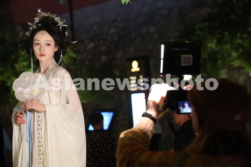 图片说明:5月2日,身着汉服的游客在陕西省西安市的大唐不夜城拍摄写真照片。