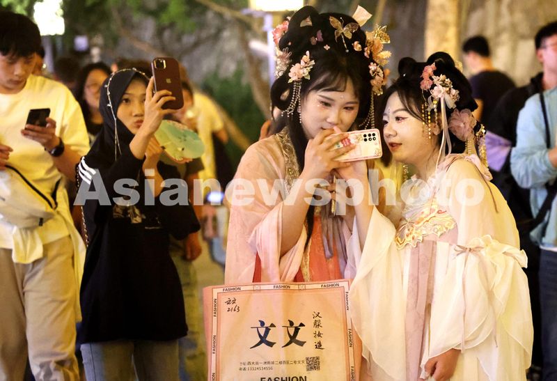 图片说明:5月2日,身着汉服的游客在陕西省西安市的大唐不夜城游玩。