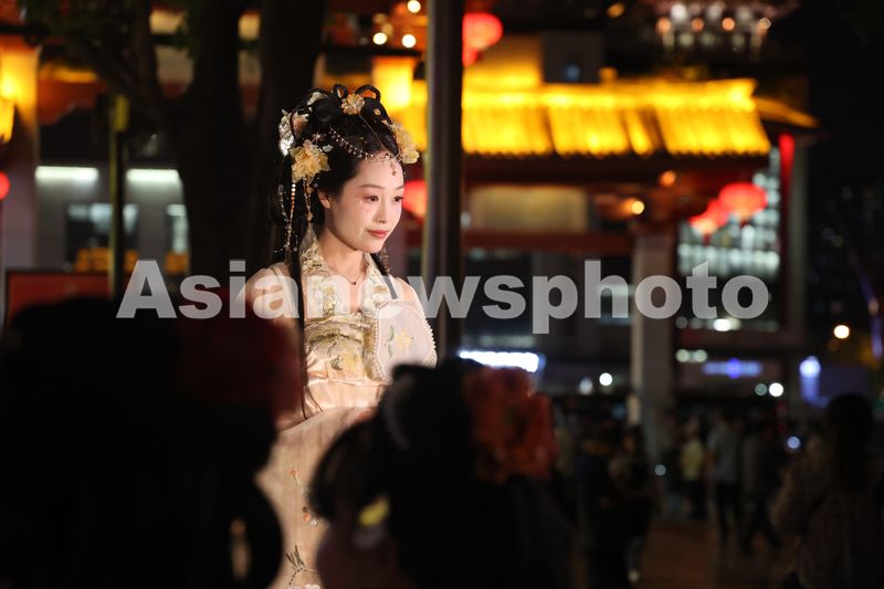 图片说明:5月2日,身着汉服的游客在陕西省西安市的大唐不夜城拍摄写真照片。