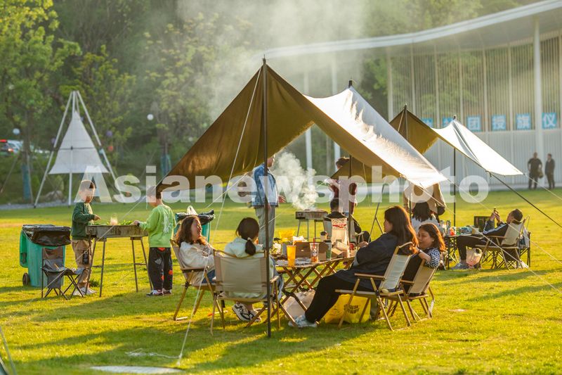 2024年5月1日,在安徽省芜湖市繁昌区孙村镇中分村途居马仁山房车露营地,数十辆房车和多顶露营帐篷错落有致分布在山林竹海间,优美的乡村生态环境,吸引了众多游客前来休闲游玩,欢度假日生活。