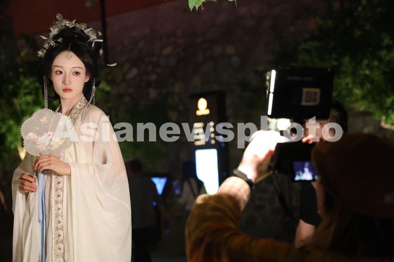 图片说明:5月2日,身着汉服的游客在陕西省西安市的大唐不夜城拍摄写真照片。