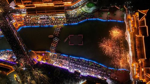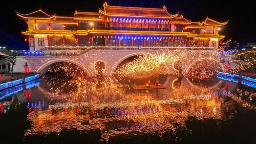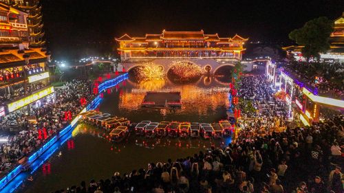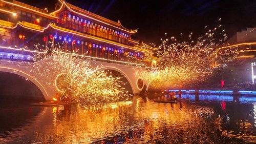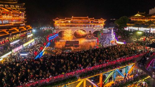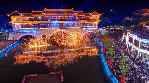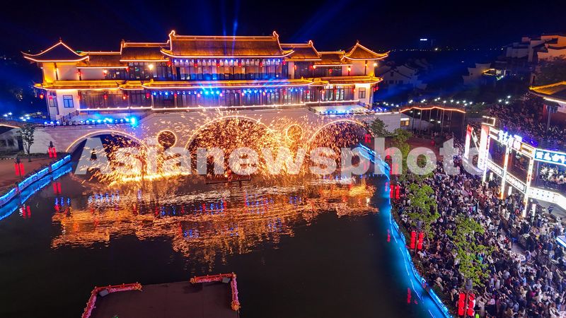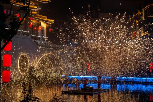 2024年5月2日,浙江省湖州市长兴县太湖龙之梦乐园,非遗“打铁花”在太湖古镇内上演,璀璨夺目的铁花在空中绽放,场面壮观,吸引众多市民、游客前来观看。
