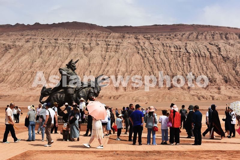 图片说明:2024年5月2日,游客在新疆吐鲁番火焰山景区游玩。