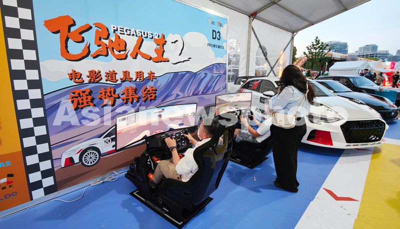 图片说明:2024年5月1日,上海,五五购物节户外潮流车展上,《飞驰人生2》里的电影道具车齐亮相,游客还能通过电子游戏体验虚拟赛车驾驶。
