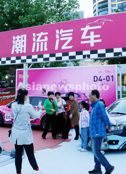图片说明:2024年5月1日,上海,五五购物节户外潮流车展上,二次元动漫痛车(时尚彩绘车)吸引市民游客打卡合影。