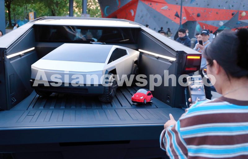 图片说明:2024年5月1日,上海,五五购物节户外潮流车展上,萌萌的特斯拉赛博儿童玩具车吸引关注。