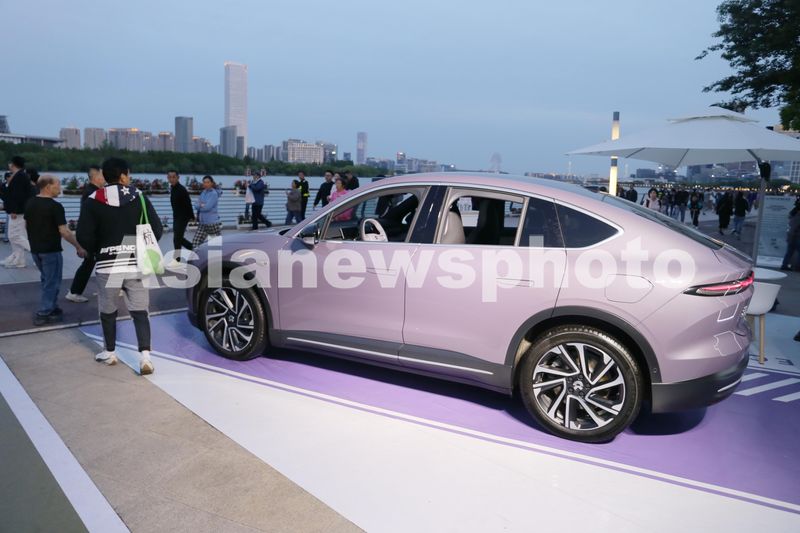图片说明:2024年5月1日,上海,五五购物节户外潮流车展亮相黄浦江畔徐汇滨江,蔚来新款EC6新能源电动车吸引关注。