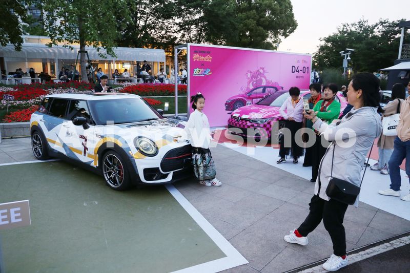 图片说明:2024年5月1日,上海,五五购物节户外潮流车展上,二次元动漫痛车(时尚彩绘车)吸引市民游客打卡合影。