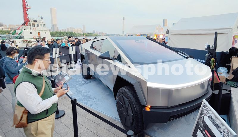 图片说明:2024年5月1日,上海,五五购物节户外潮流车展亮相黄浦江畔徐汇滨江,科幻味道十足的特斯拉赛博越野旅行车吸引关注。