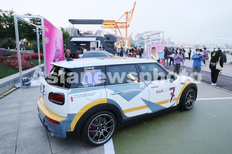 图片说明:2024年5月1日,上海,五五购物节户外潮流车展亮相黄浦江畔的徐汇滨江,二次元动漫痛车(时尚彩绘车)吸引市民游客。