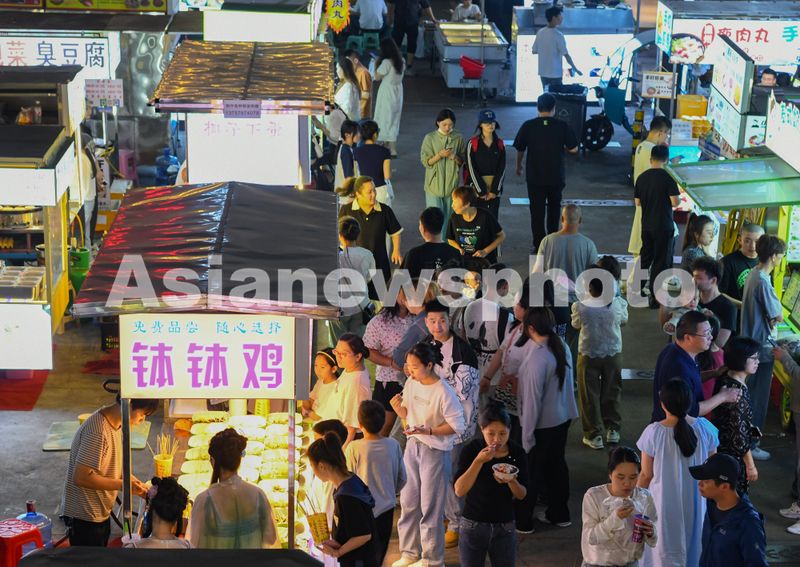 图片说明:2024年5月6日,浙江省金华市金帆街“金谷夜市”,顾客在摊位前购买各种小吃。