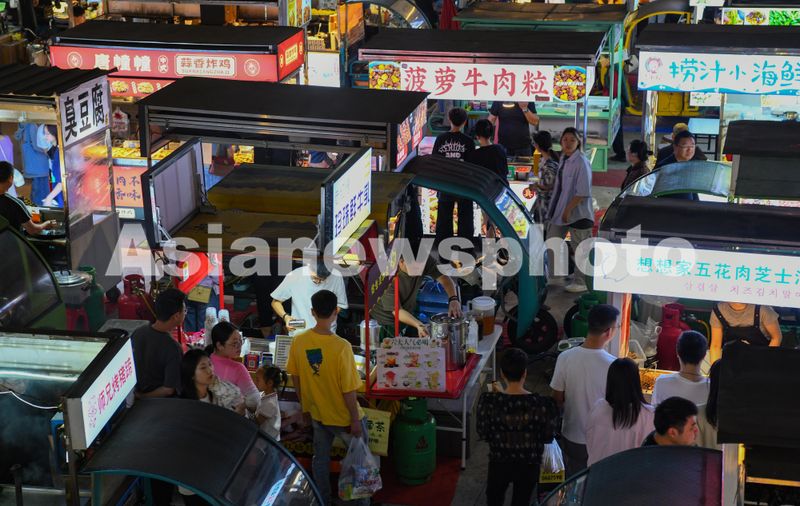 图片说明:2024年5月6日,浙江省金华市金帆街“金谷夜市”,顾客在摊位前购买各种小吃。