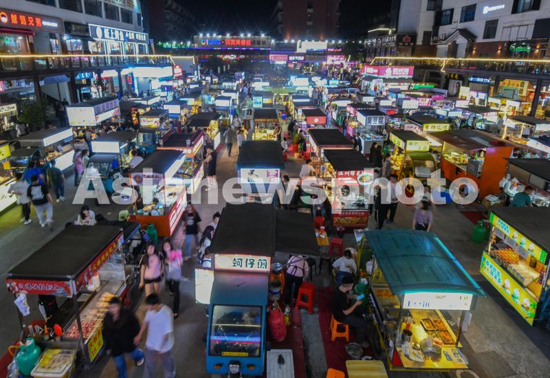 图片说明:2024年5月6日,浙江省金华市金帆街“金谷夜市”,顾客在摊位前购买各种小吃。