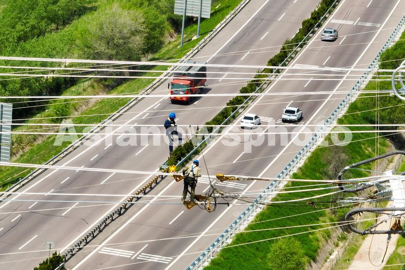 2024年5月16日,电力工人正在位于宁夏固原市隆德县境内的“宁电入湘”工程宁2标段进行导线展放作业。